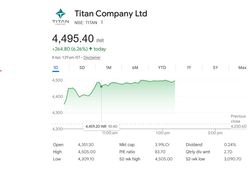 टाइटन के शेयर मंगलवार को 4230.60 रुपये पर बंद हुए थे, जो बुधवार को बढ़कर 4505 रुपये तक पहुंच गए। यानी एक ही दिन में शेयर में 274.40 रुपये की तेजी आई। इस तरह की मजबूत बढ़त ने बाजार में कंपनी के प्रति सकारात्मक माहौल बना दिया है और निवेशकों की दिलचस्पी बढ़ाई है।