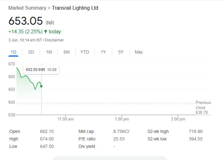 ट्रांसरेल लाइटिंग का आईपीओ दिसंबर 2024 में आया था, जिसकी इश्यू प्राइस 432 रुपये प्रति शेयर थी। लिस्टिंग के दिन ही शेयर ने शानदार शुरुआत करते हुए 590 रुपये तक की छलांग लगाई। 2 जून को यह शेयर 4.8% की तेजी के साथ 637.75 रुपये पर बंद हुआ था, जबकि आज 3 जून की सुबह 10:14 बजे यह 2.25% चढ़कर 653.05 रुपये पर ट्रेड कर रहा है।
