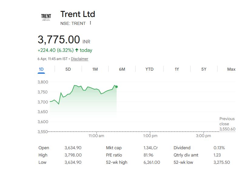 पिछले सत्र में ट्रेंट का शेयर 3,550.60 रुपये पर बंद हुआ था। सोमवार को यह 6.32% की तेजी के बाद लगभग 3,775 रुपये पर कारोबार कर रहा था। हालांकि, इस साल अब तक कंपनी के शेयर में करीब 12% की गिरावट आई है, लेकिन तिमाही नतीजों और मजबूत स्टोर विस्तार ने निवेशकों की उम्मीदों को नई रफ्तार दी है।