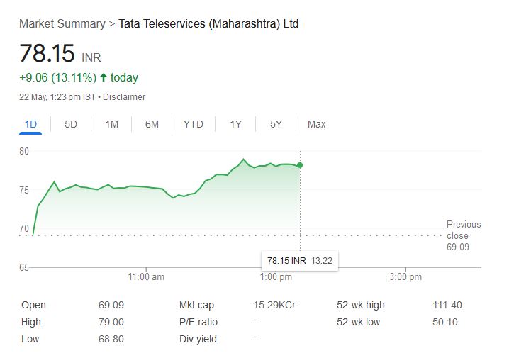 गुरुवार, 22 मई 2025 को दोपहर 1:23 बजे TTML का शेयर 13% से ज्यादा की छलांग लगाकर 78.15 रुपये पर पहुंच गया। खास बात यह है कि इस दिन ट्रेडिंग वॉल्यूम सामान्य से 7 गुना अधिक रहा। एक दिन पहले यानी बुधवार को भी कंपनी के शेयर में 18% से ज्यादा की उछाल आई थी और शेयर 69.05 रुपये पर बंद हुआ था।