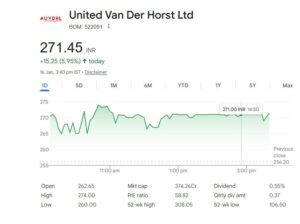 शुक्रवार को बाजार बंद होने तक United Van Der Horst Ltd. का शेयर 271.45 रुपये के स्तर पर था, जिसमें 5.95 प्रतिशत की जोरदार तेजी देखने को मिली है। पिछले एक महीने में शेयर की कीमतों में 82 प्रतिशत की बढ़ोतरी हुई है। वहीं, पिछले छह महीनों में स्टॉक 107 प्रतिशत रिटर्न दे चुका है, जिससे निवेशकों का पैसा दोगुना हो गया है। कंपनी का मार्केट कैप 374.26 करोड़ रुपये है। 52-सप्ताह का हाई 308.05 रुपये और लो 106.50 रुपये रहा। पिछले एक साल में स्टॉक में कुल 118 प्रतिशत की तेजी आई है। तीन साल में शेयर ने 529 प्रतिशत और पांच साल में 2510 प्रतिशत की बढ़ोतरी दिखाई है। YTD आधार पर स्टॉक में 67 प्रतिशत की बढ़ोतरी दर्ज की गई है।
