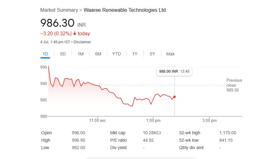 शुक्रवार दोपहर 1:46 बजे तक Waaree Renewable Technologies Ltd का स्टॉक 986.30 रुपये पर ट्रेड कर रहा था। 5 साल में यह शेयर 1-2 रुपये के भाव से सीधा 2700 रुपये के लेवल को पार करने के बाद अब 986 रुपये के आसपास कारोबार कर रहा है।