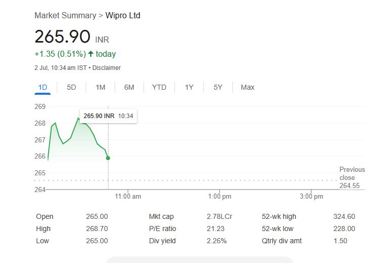 - विप्रो शेयर ₹265 पर खुला और ₹268.70 का दिन का हाई छुआ।