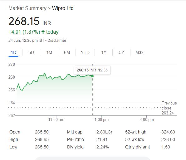 Wipro Share Price: मंगलवार, 24 जून 2025 को घरेलू शेयर बाजार ने सकारात्मक शुरुआत की है। जिससे 30 शेयरों वाला बीएसई सेंसेक्स 855.26 अंक या 1.04% की बढ़त के साथ 82,752.05 अंक पर पहुंच गया और एनएसई निफ्टी 280.05 अंक या 1.12% चढ़कर 25,251.95 अंक के स्तर पर पहुंच गया है।