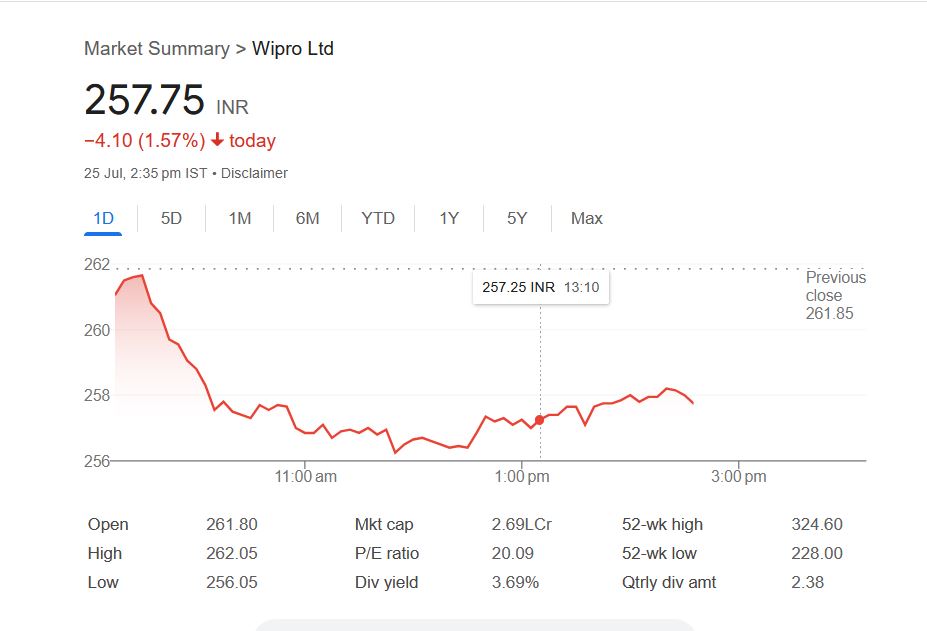 Wipro Share Price: आज, शुक्रवार, 25 जुलाई 2025 को विप्रो लिमिटेड कंपनी का स्टॉक 1.57% की गिरावट के साथ 257.75 रुपये पर ट्रेड कर रहा हैं। आज सुबह स्टॉक मार्केट में ट्रेडिंग शुरू होते ही विप्रो शेयर 261.80 रुपये पर ओपन हुआ था। आज दोपहर तक विप्रो कंपनी शेयर ने दिन के 262.05 रुपये के इंट्रा-डे हाई को छुआ। वहीं, शेयर का लो-लेवल 256.05 रुपये था।
