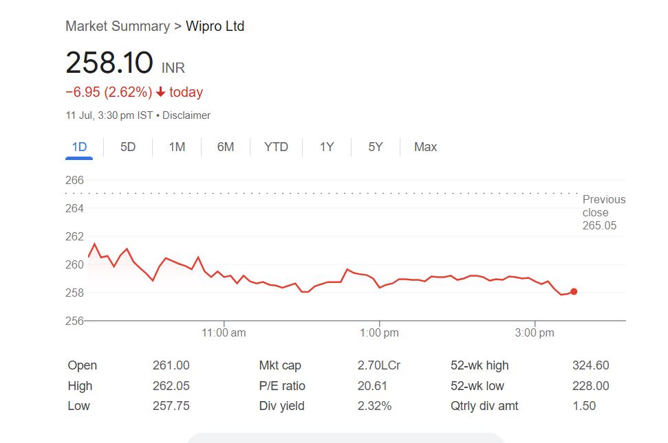 Wipro Share Price: शुक्रवार, 11 जुलाई 2025 को विप्रो लिमिटेड के शेयर में 2.62% की गिरावट देखी गई और यह 258.10 रुपये पर बंद हुआ था। इस स्टॉक ने दिन की शुरुआत 261 रुपये पर की थी और शेयर ने दिन के उच्चतम स्तर 262.05 रुपये व न्यूनतम 257.75 रुपये के स्तर को छुआ। हालांकि स्टॉक गिरावट में रहा, लेकिन एनालिस्ट्स को इसमें आगे चलकर जबरदस्त तेजी की उम्मीद है।