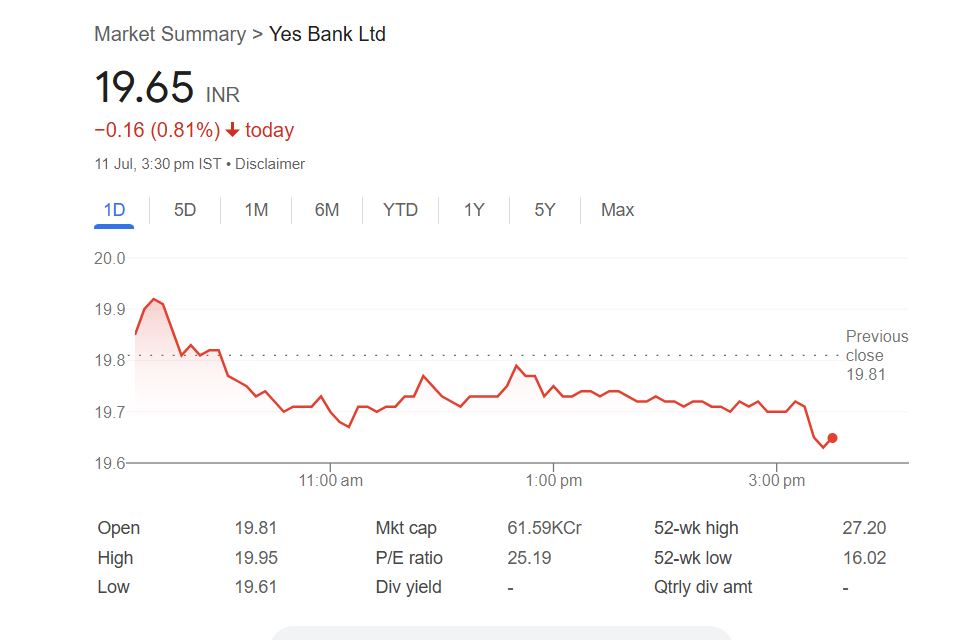 Yes Bank Share Price: शुक्रवार, 11 जुलाई को यस बैंक लिमिटेड के शेयर में मामूली गिरावट दर्ज की गई और यह 0.81% गिरकर 19.65 रुपये पर बंद हुआ। दिन की शुरुआत में यह शेयर 19.81 रुपये पर खुला था और कारोबार के दौरान 19.95 रुपये के हाई और 19.61 रुपये के लो तक गया। इससे स्पष्ट है कि शेयर फिलहाल एक सीमित दायरे में ही कारोबार कर रहा है।