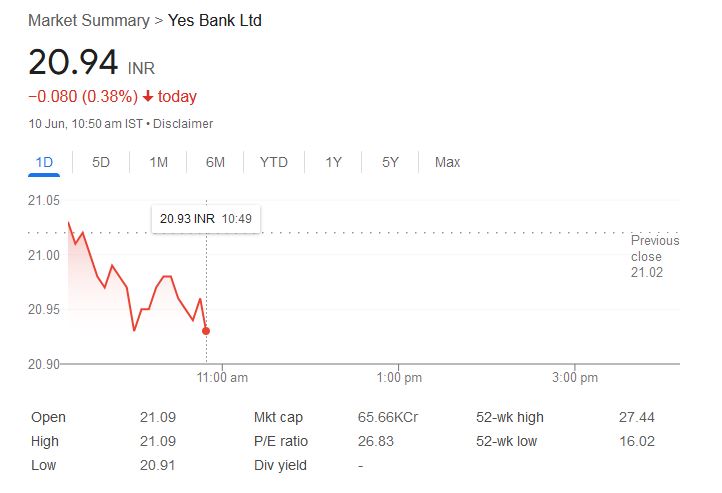 यस बैंक के शेयरों ने बीते एक साल में 27.44 रुपये के हाई और 16.02 रुपये के को लो छुआ है। मौजूदा कीमत इसकी उच्चतम सीमा से 23.58% नीचे है, लेकिन न्यूनतम स्तर से 30.9% ऊपर है। स्टॉक एक्सचेंज के आंकड़ों के मुताबिक, बीते 30 दिनों में यस बैंक के प्रतिदिन औसतन 9.24 करोड़ शेयरों की ट्रेडिंग हुई है।