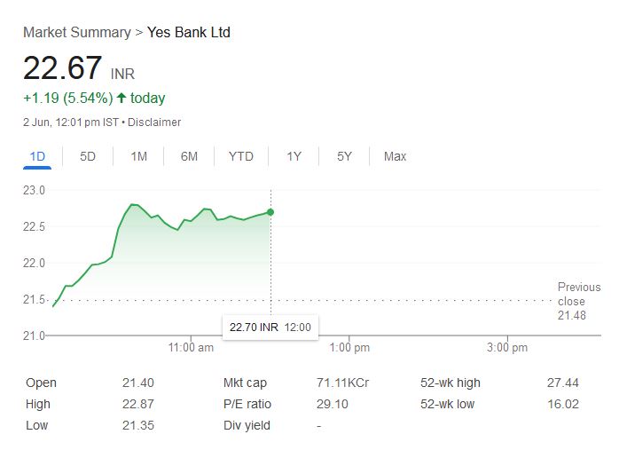 - यस बैंक का स्टॉक 5% चढ़ा, 22.87 रुपये के हाई पर पहुंचा।