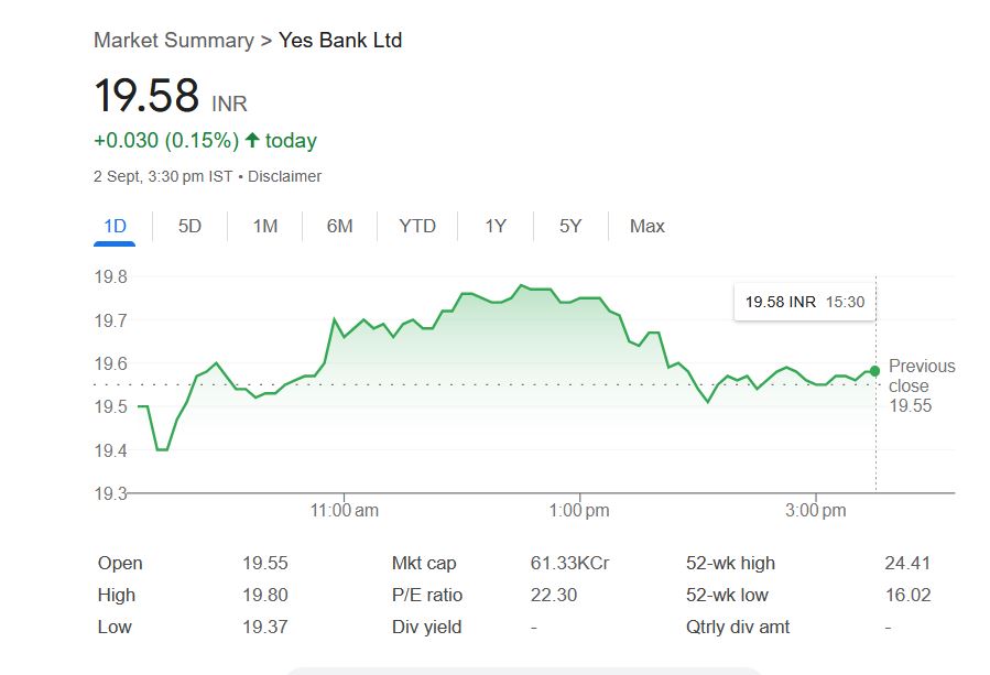 - यस बैंक का शेयर ₹19.58 पर बंद हुआ