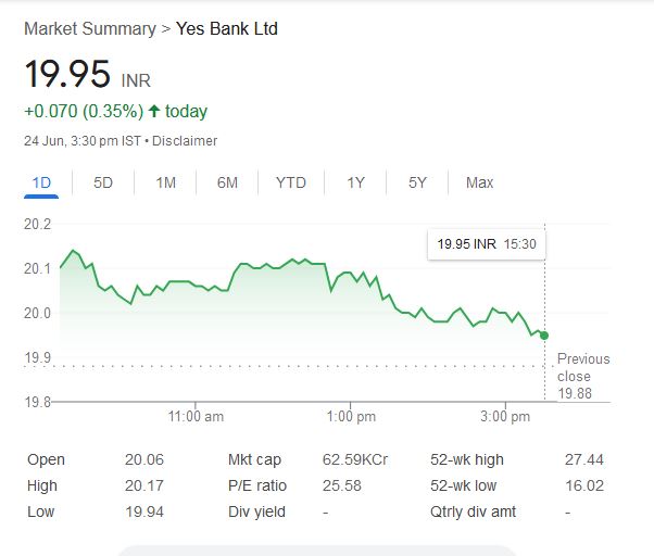 Yes Bank Share Price: मंगलवार, 24 जून 2025 को यस बैंक लिमिटेड के शेयर हल्की तेजी के साथ फोकस में रहा। आज के कारोबार के दौरान इसमें 1% से अधिक की बढ़त देखी गई और यह शेयर 20.17 रुपये इंट्रा-डे हाई तक पहुंच गया। हालांकि, ब्रोकरेज फर्म गोल्डमैन सैक्स ने इस शेयर को लेकर चिंता जताई है और भविष्य में भारी गिरावट की चेतावनी दी है।