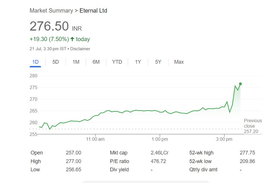 कमजोर मुनाफे के बावजूद Zomato Ltd के शेयरों में उछाल देखने को मिली। सोमवार 21 जुलाई को शेयर में दिन के दौरान 7.50% तक की उछाल आई और यह 277 रुपये तक पहुंच गया। जो दिन के आखिरी में यह 276.50 रुपये पर बंद हुआ।