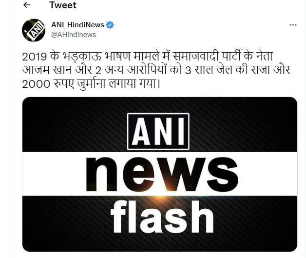 समाजवादी पार्टी के वरिष्ठ नेता आज़म खान को रामपुर कोर्ट ने भड़काऊ भाषण मामले में दोषी करार दिया। 2019 के भड़काऊ भाषण मामले में समाजवादी पार्टी के नेता आजम खान और 2 अन्य आरोपियों को 3 साल जेल की सजा और 2000 रुपए जुर्माना लगाया गया।