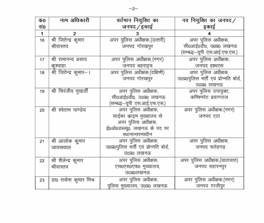 IPS Transfer In UP जितेंद्र कुमार श्रीवतास्तव को अपर पुलिस अधीक्षक सीआईडी उत्तर प्रदेश लखनऊ (सम्बद्ध-यूपी एसआई एफएस), रामानंद प्रसाद कुशवाहा को अपर पुलिस अधीक्षक हाथरस, जितेंद्र कुमार प्रथम को अपर पुलिस अधीक्षक उत्तर प्रदेश पुलिस भर्ती एवं प्रोन्नति बोर्ड लखनऊ, चिरंजीव मुखर्जी को अपर पुलिस उपायुक्त प्रयागराज कमिश्नरेट, श्वेताभ पांडेय को अपर पुलिस अधीक्षक नगर एटा, आलोक कुमार जयसवाल को अपर पुलिस अधीक्षक फतेहगढ़, शैलेन्द्र कुमार श्रीवतास्तव को अपर पुलिस अधीक्षक ट्रैफिक सहारनपुर और डॉ. राकेश कुमार मिश्रा को अपर पुलिस अधीक्षक नगर गाजीपुर बनाया गया है।
