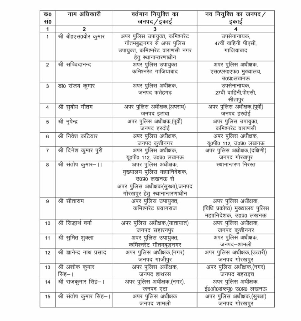 जारी सूची के अनुसार बी.एस.वीर कुमार को उपसेनानायक 47वीं वाहिनी पीएससी गाजियाबाद बनाया गया है। इसके साथ ही सच्चिदानंद को अपर पुलिस अधीक्षक एसएसएफ मुख्यलय लखनऊ, डॉक्टर संजय कुमार को उपसेनानायक 27वीं वाहिनी पीएससी सीतापुर और सुबोध गौतम को अपर पुलिस अधीक्षक पूर्वी हरदोई की जिम्मेदारी सौंपी गई है।