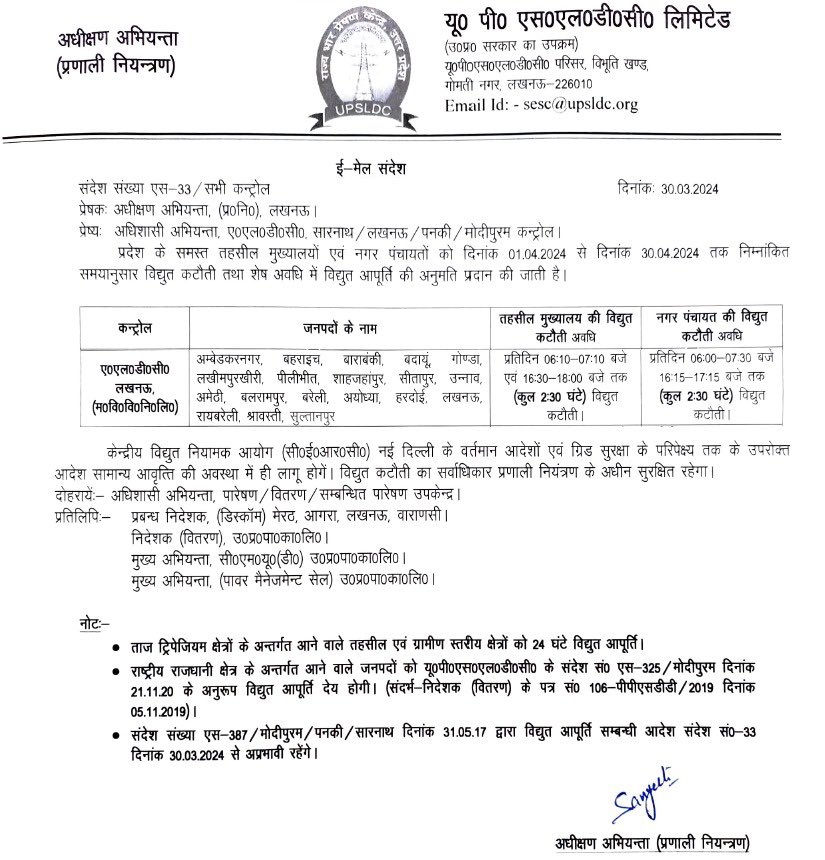 अधीक्षण अभियन्ता प्रणाली नियन्त्रण द्वारा जारी किए गए पत्र के मुताबिक उत्तर प्रदेश के अंबेडकरनगर,बाराबंकी,बहराइच, बदायूं, गोण्डा, बाराबंकी, लखीमपुर खीरी, पीलीभीत, शाहजहांपुर, सीतापुर उन्नाव, अमेठी, बलरामपुर, बरेली, हरदोई, लखनऊ, रायबरेली, श्रावस्ती तथा सुल्तानपुर जनपद में प्रतिदिन ढाई घंटे बिजली कटौती की जाएगी।
