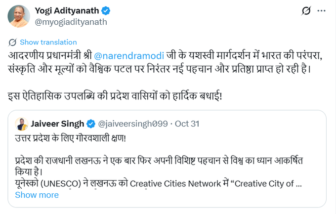 Lucknow News: सीएम ने लिखा कि "प्रधानमंत्री नरेंद्र मोदी के मार्गदर्शन में भारत की परंपरा, संस्कृति और मूल्यों को वैश्विक मंच पर निरंतर नई पहचान और प्रतिष्ठा मिल रही है। इस ऐतिहासिक उपलब्धि पर प्रदेशवासियों को हार्दिक बधाई।"