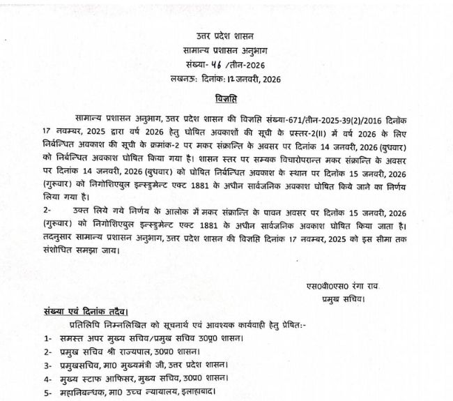 लखनऊ: Tomorrow Public Holiday or Not मकर संक्रांति की छुट्टी में प्रदेश सरकार ने बदलाव किया है। प्रदेश में अब संक्रांति की छुट्टी 14 जनवरी 2026 के बजाए 15 जनवरी को रहेगी। इस संबंध में सरकार ने अधिकारिक निर्देश जारी कर दिया है। उत्तर प्रदेश सरकार के इस आदेश के बाद अब प्रदेश के सभी सरकारी कार्यालय और स्कूल 15 जनवरी को बंद रहेंगे।