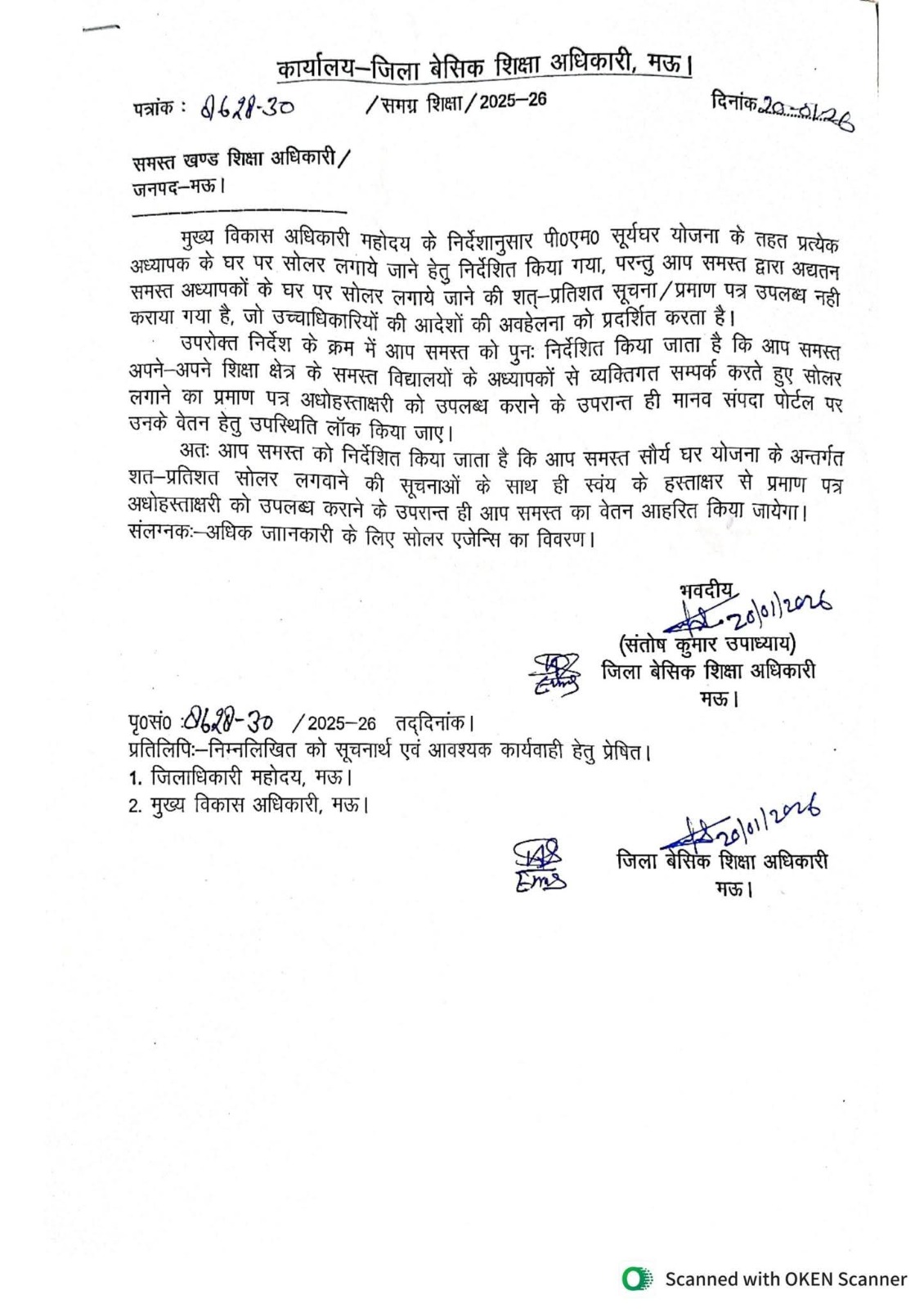 दरअसल, इन दिनों सोशल मीडिया पर एक पत्र वायरल हो रहा है, जिसमें प्राथमिक विद्यालयों में कार्यरत शिक्षकों को अनिवार्य रूप से अपने घरों पर सोलर पैनल लगवाकर उसका प्रमाण पत्र जमा करने को कहा गया है आदेश में स्पष्ट किया गया है कि प्रमाण पत्र उपलब्ध न कराने की स्थिति में शिक्षकों का वेतन रोका जा सकता है। पत्र में समस्त खण्ड शिक्षा अधिकारियों को मुख्य विकास अधिकारी के निर्देशानुसार शत-प्रतिशत अनुपालन सुनिश्चित करने को कहा गया था। पत्र में यह भी निर्देशित किया गया था कि खण्ड शिक्षा अधिकारी अपने-अपने क्षेत्रों के शिक्षकों से व्यक्तिगत संपर्क कर प्रमाण पत्र प्राप्त करें। चेतावनी दी गई थी कि प्रमाण पत्र जमा होने के बाद ही मानव संपदा पोर्टल पर वेतन हेतु उपस्थिति लॉक की जाएगी।