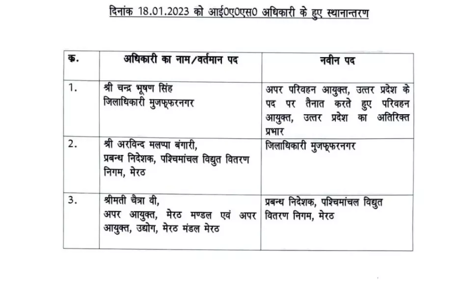 Transfer of UP Muzaffarnagar IAS Officers : यूपी के जिन 3 आईएएस अधिकारियों के तबादले किए गए हैं, उनमें आईएएस अधिकारी चंद्र भूषण सिंह को अपर आयुक्त, परिवहन निगम नियुक्त किया गया है। इसके साथ ही उन्हें परिवहन आयुक्त का प्रभार सौंपा गया है। चैत्रा वी को प्रबंध निदेशक, पश्चिमांचल विद्युत वितरण निगम, मेरठ नियुक्त किया गया है। अरविंद मल्लप्पा बंगारी को मुजफ्फरनगर का जिला अधिकारी नियुक्त किया गया है।