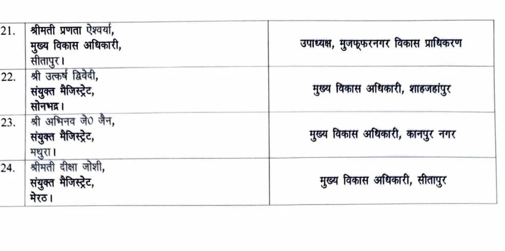 UP IAS Transfer: सरकार की ओर से जारी आदेश के अनुसार अविनाश कुमार डीएम गाजीपुर से डीएम अलीगढ़, अरविंद सिंह अपर भूमि व्यवस्था आयुक्त राजस्व परिषद से डीएम एटा, अमित आसेरी विशेष सचिव लोक निर्माण विभाग से डीएम बांदा, डा. अंकुर लाठर उपाध्यक्ष बुलंदशहर खुर्जा विकास प्राधिकरण से डीएम फर्रुखाबाद बनाए गए हैं। कविता मीना उपाध्यक्ष मुजफ्फरनगर विकास प्राधिकरण से डीएम हापुड़, ईशा प्रिया विशेष सचिव पर्यटन विभाग से डीएम अंबेडकरनगर, चर्चित गौड़ अपर मुख्य कार्यपालक अधिकारी उत्तर प्रदेश राज्य औद्योगिक विकास प्राधिकरण कानपुर नगर से डीएम सोनभद्र, अनुपम शुक्ला डीएम अंबेडकरनगर से डीएम गाजीपुर, शशांक त्रिपाठी डीएम बाराबंकी से डीएम अयोध्या, ईशान प्रताप सिंह विशेष सचिव मुख्यमंत्री तथा नागरिक उड्डयन विभाग एवं निदेशक नागरिक उड्डयन से डीएम बाराबंकी बनाए गए हैं।