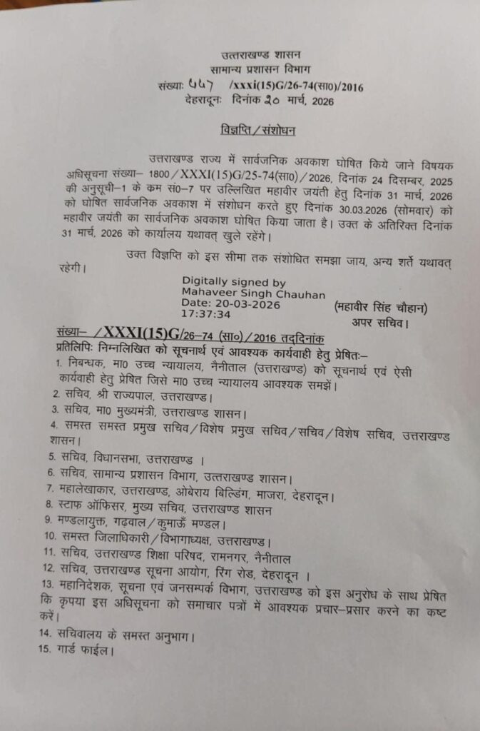 जारी नए आदेश में बताया गया है कि, “उत्तराखण्ड राज्य में सार्वजनिक अवकाश घोषित किये जाने विषयक अधिसूचना संख्या 1800/XXXI(15)G/25-74(सा)/2026, दिनांक 24 दिसम्बर, 2025 की अनुसूची-1 के खंड सं०-7 पर उल्लिखित महावीर जयंती हेतु दिनांक 31 मार्च, 2026 को घोषित सार्वजनिक अवकाश में संशोधन करते हुए दिनांक 30.03.2026 (सोमवार) को महावीर जयंती का सार्वजनिक अवकाश घोषित किया जाता है। (Public Holiday Declared State Govt) उक्त के अतिरिक्त दिनांक 31 मार्च, 2026 को कार्यालय यथावत खुले रहेंगे। उक्त विज्ञप्ति को इस सीमा तक संशोधित समझा जाय, अन्य शर्तें यथावत् रहेंगी।”