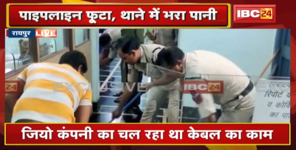 Raipur : Telibandha में मुख्य पाइपलाइन क्षतिग्रस्त, थाना के भीतर घुसा पानी। 2 लाख लोगों को सुबह नहीं मिलेगा पानी