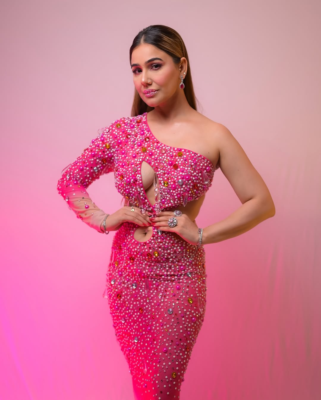 इस पिंक बॉडीकॉन ड्रेस में मोतियों और शाइनी डिटेलिंग के साथ वन-शोल्डर डिज़ाइन और कटआउट पैटर्न उनके ग्लैमर को और भी बढ़ा रहा है।