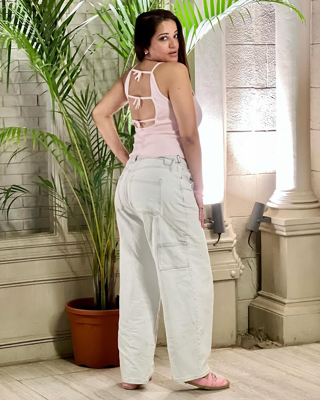 इन लेटेस्ट तस्वीरों में मोनालिसा ने व्हाइट टैंक टॉप और हाई-वेस्ट डेनिम पहना हुआ है।