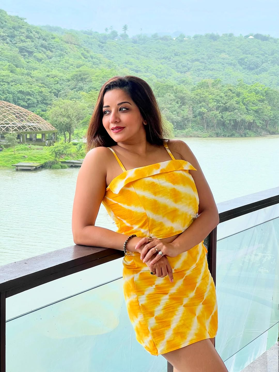 मोनालिसा येलो एंड व्हाइट प्रिंटेड मिनी ड्रेस में नजर आ रही हैं, वो इनमें बेहद हॉट लग रही हैं।