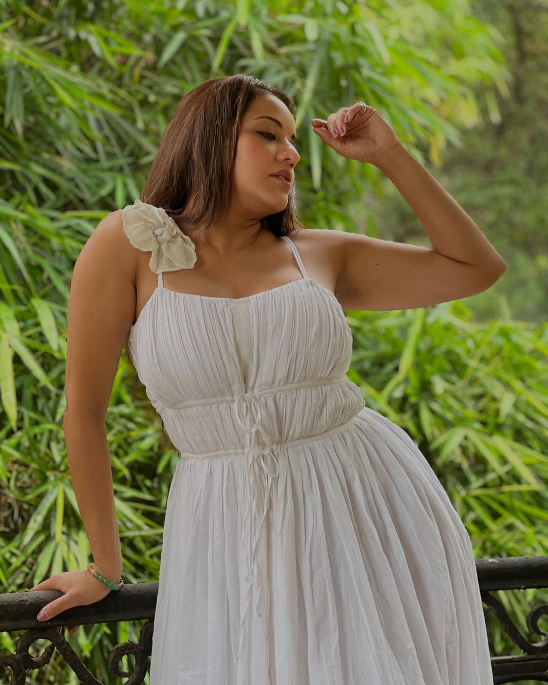 लुक को पूरा करने के लिए मोनालिसा ने बहुत ही सिंपल मेकअप किया है। साथ ही बालों को खुला रखने के साथ उसपर सफेद कलर का हेयर बैंड भी लगाया है।