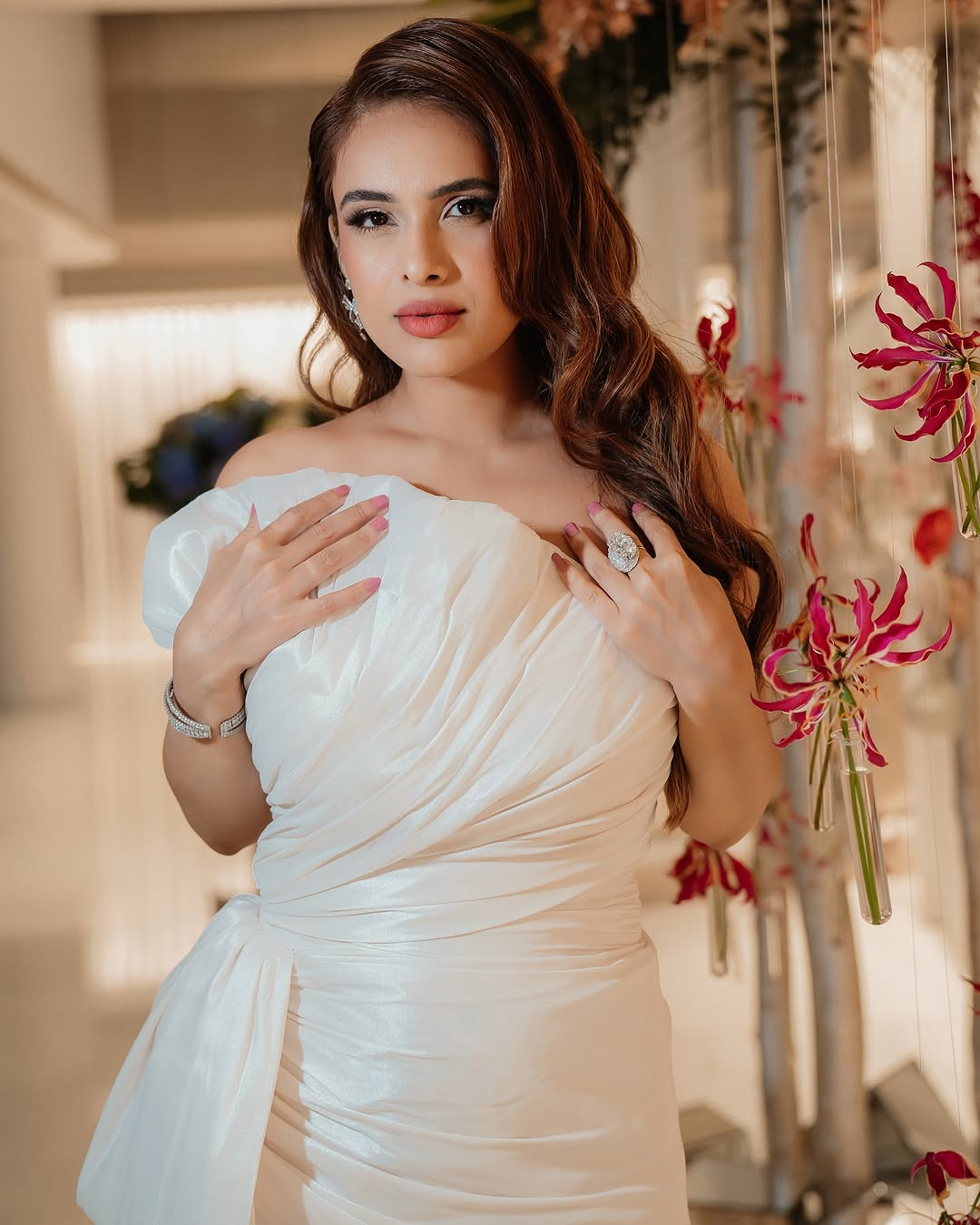 इन तस्वीरों में नेहा मलिक व्हाइट कलर की ऑफ शोल्डर गाउन पहने स्टाइलिश पोज देती नजर आ रही हैं।