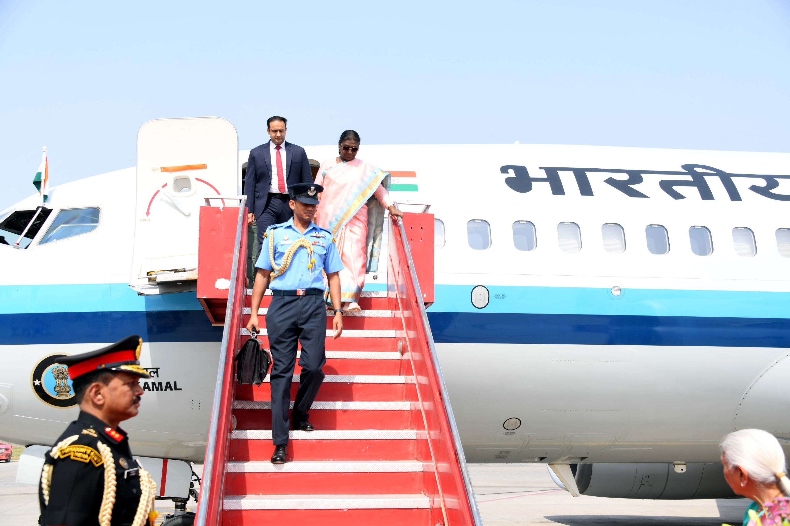 महर्षि वाल्मीकि एयरपोर्ट पर राज्यपाल आनंदीबेन पटेल, मुख्यमंत्री योगी आदित्यनाथ, उपमुख्यमंत्री केशव प्रसाद मौर्य, उपमुख्यमंत्री बृजेश पाठक ने उनका स्वागत किया।