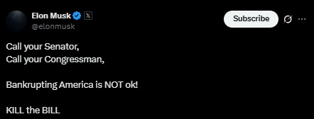 यह विधेयक मस्क की कंपनी टेस्ला को मिलने वाली सब्सिडी में कटौती करेगा। मस्क ने रिपब्लिकन पार्टी के नेताओं को धमकी भरे अंदाज में एक ‘पोस्ट’ में लिखा, ‘‘अगले वर्ष नवंबर में हम उन सभी नेताओं को बर्खास्त कर देंगे जिन्होंने अमेरिकी जनता के साथ विश्वासघात किया है।’’ इससे पहले उन्होंने उन रिपब्लिकन सांसदों को हराने में मदद करने की बात की थी जो ट्रंप के प्रति वफादार नहीं माने जा रहे थे लेकिन अब वह ऐसा सुझाव देते प्रतीत होते हैं कि अगर सांसद राष्ट्रपति की विधायी प्राथमिकता का समर्थन करते हैं तो उन्हें हटाने का प्रयास किया जाए।