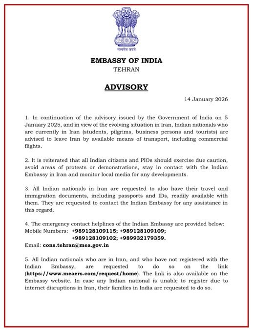 गौरतलब है कि ईरान में हाल ही के दिनों में बड़े पैमाने पर विरोध प्रदर्शन, हिंसा और सुरक्षा कार्रवाई की खबरें सामने आई हैं, जिसके चलते विदेशी नागरिकों की सुरक्षा को लेकर चिंताएं बढ़ गई हैं। (Indian citizens leave Iran advisory) अमेरिका ईरान को लगातार सैन्य कार्रवाई की धमकी दे रहा है, अमेरिकी सेना स्टैंडबाय मोड पर है, फिलहाल सैन्य कार्रवाई पर रोक लगी है लेकिन राष्ट्रपति डोनाल्ड ट्रंप ने साफ तौर पर कहा है कि जरूरत पड़ी तो वह सैन्य कार्रवाई से पीछे नहीं हटेंगे।
