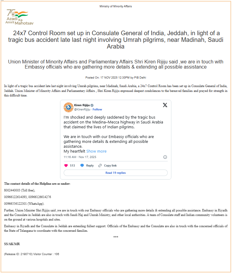 मदीना के निकट उमराह बस दुर्घटना के बाद भारत ने 24x7 हेल्पलाइन जारी की गई। जेद्दा के भारतीय महावाणिज्य दूतावास ने एक हेल्पलाइन नंबर जारी किया है। एक सोशल मीडिया पोस्ट में, वाणिज्य दूतावास ने बताया कि परिसर में एक 247 नियंत्रण कक्ष स्थापित किया गया है।