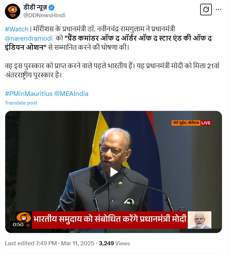- भारत-मॉरीशस संबंधों को मजबूत करने के लिए पीएम मोदी को प्रतिष्ठित अंतरराष्ट्रीय पुरस्कार